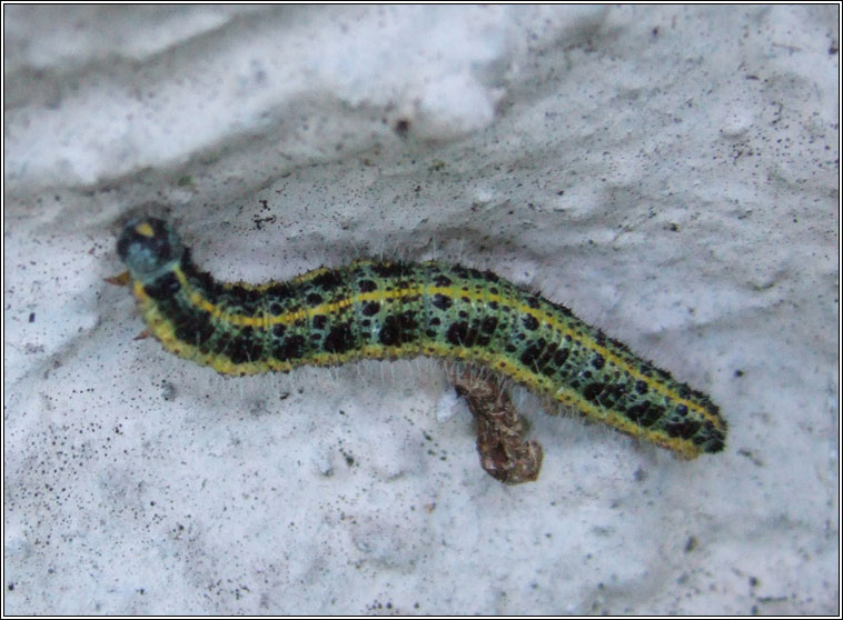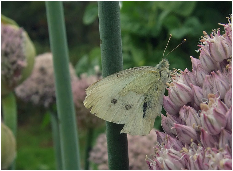 Pieris brassicae Widespread, common Wingspan: 63-76mm Flight time: April-September, two broods Habitat: Gardens, grassy areas, woodlands Larval food plants: Brassica's and crucifers including Cabbages, Nasturtium, Garlic Mustard. |