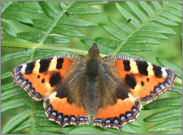 Aglais urticae Widespread, common Wingspan: 50-55mm Flight time: April-September, two broods Habitat: Hedgerows, gardens, woodlands Larval food plant: Nettles |