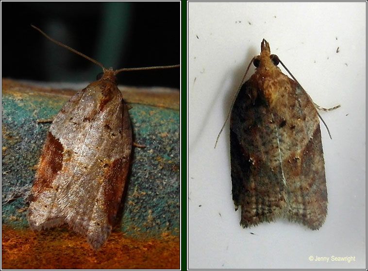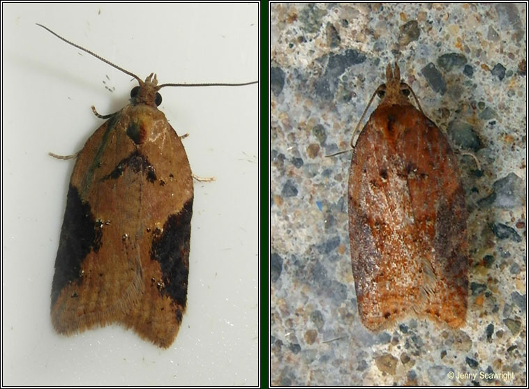 Acleris laterana and Acleris comariana are very difficult to separate. Adults require genitalia examination but larva can be distinguished in later instars. Wingspan: A. laterana: 15-20mm. A. comariana: 13-18mm Flight time: A. laterana: Aug-Sept. A. comariana: Jun-Jul, late Aug-Nov Food plants: A. laterana: May-June, rosaceous trees and shrubs, Salix, Vaccinium A. comariana: Wild and cultivated strawberry |