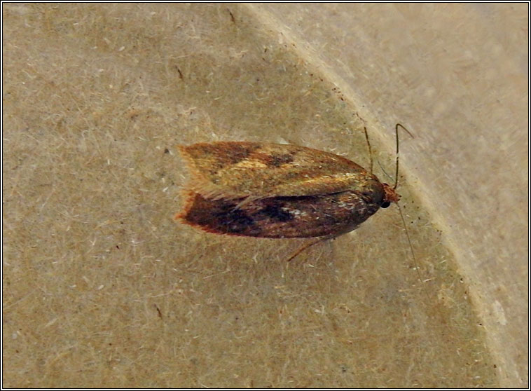Family: Tortricidae Sub-family: Tortricinae 1055 * Acleris hyemana Wingspan: 12-19mm Flight time: September-April. Habitat: Moors and heathland Larvae feed in spun shoots of heather |