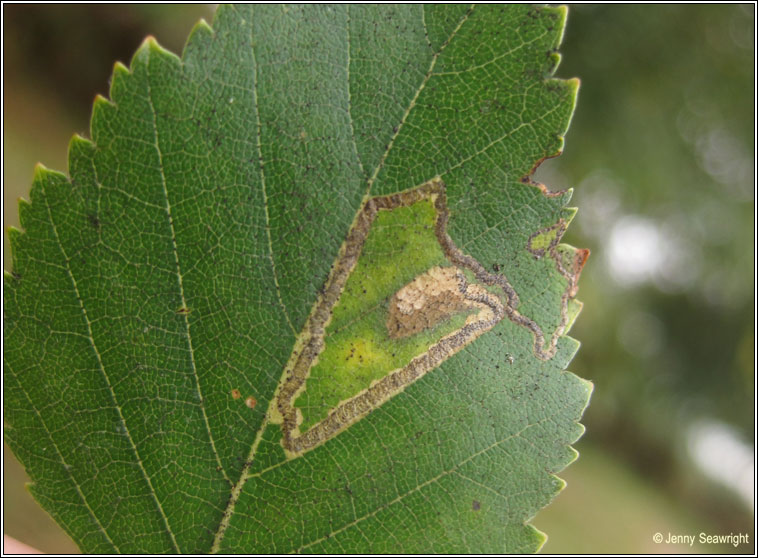 Family: Nepticulidae 113 * Stigmella sakhalinella Leaf mine photographs on Birch, Betula. UK September 2011Wingspan: 4-5mm Flight time: Two generations, May and July-August Food plant: Birch (Betula spp.) Mine: July - October Egg underside, near margin or leaf tip. A slender corridor with irregularly scalloped sides, the coils of blackish-brown frass always leaving narrow, clear edges. Similar: Stigmella continuella |