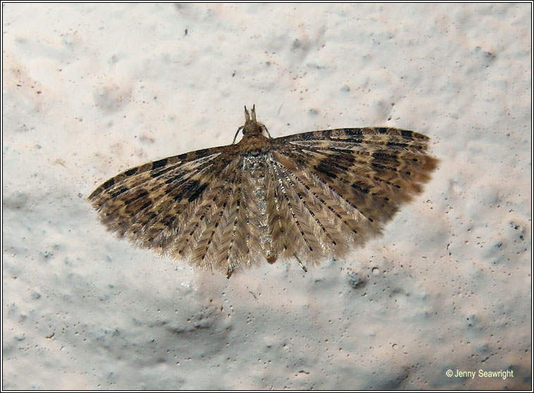 Alucita hexadactyla Widespread, common Wingspan: 14-16mm Flying throughout the year, most frequent April-May, August-September Food plant: Leaves and buds of Honeysuckle (Lonicera) |