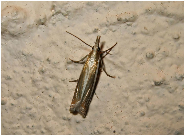 Widespread, common Wingspan: 21-26mm Flight time: June-August Habitat: Grassy areas Food plant: Grasses, Fescues and Moor-grass; Festuca ovina, Trichophorum caespitosum, Molinia caerulea Similar: Crambus uliginosellus |