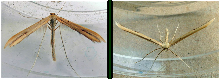 Widespread. One of the most common 'Plume' moths Wingspan: 18-27mm Flight time: Throughout the year Habitat: Where foodplant occurs; hedges, fields, parks, gardens Food plant: Flowers and leaves of Bindweed (Convolvulus and Calystegia spp.). Larvae are in two overlapping generations, late May-September |