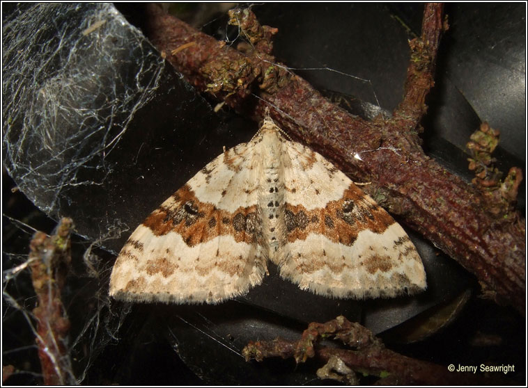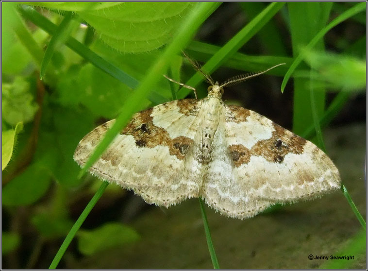 Xanthorhoe montanata Widespread, common Wingspan: 24-28mm Flight time: May-August Habitat: Damp woods, heaths, gardens, hedges Larvae feed on herbaceous plants including Bedstraw's and Primrose |