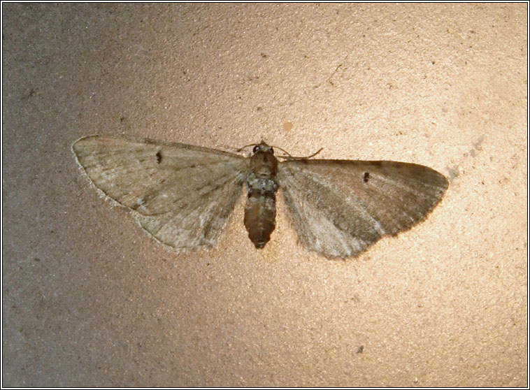 Eupithecia absinthiata Locally common Wingspan: 21-23mm Flight time: June-August Habitat: Woods, gardens, waste ground Larval food plants include Yarrow, Ragwort, Mugwort, Goldenrod Ling Pug, Eupithecia absinthiata f. goossensiata is considered to be a heathland race of E. absinthiata that feeds on heather flowers |