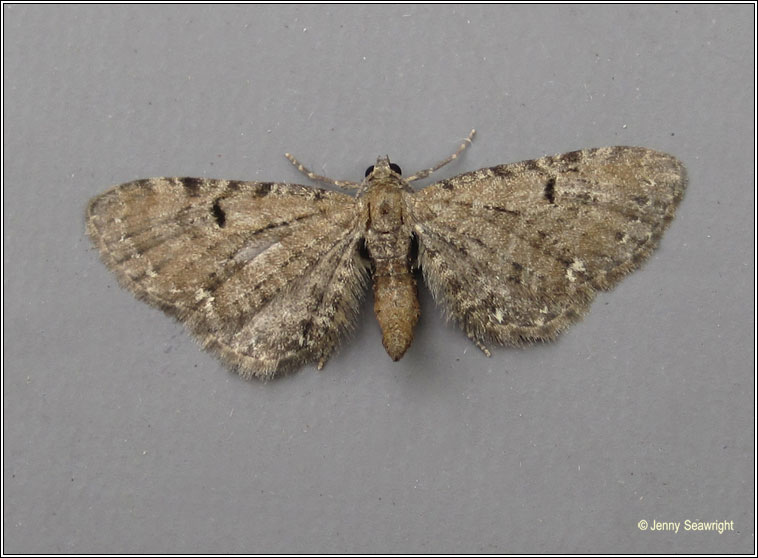 Family: Geometridae Sub-family: Larentiinae 1831 * Ling Pug * Eupithecia absinthiata f. goossensiata Wingspan: 22-26mm. Characteristic dark band on abdomen Flight time: June-July Habitat: Heathland and moorland Larval feed on the flowers of Ling and other heathers Similar: Wormwood Pug, E. absinthiata |