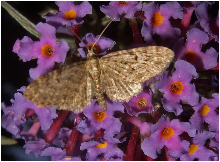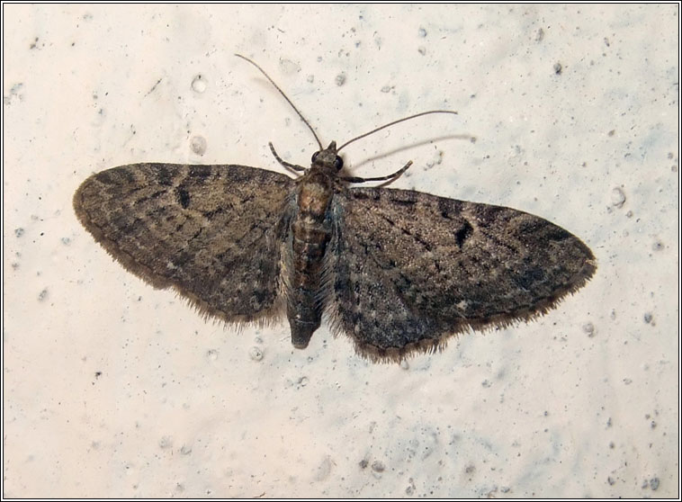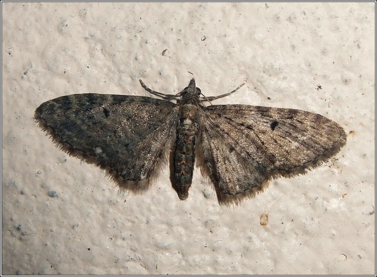 Eupithecia virgaureata Widespread Wingspan: 17-23 mm Flight time: Two generations, April-August Habitat: Verges, waste ground, farmland, woods Foodplant of first generation of larvae is unknown. Second generation feeds on flowers of Golden-rod (Solidago virgaurea) and Ragwort. Similar: Grey Pug |