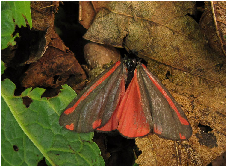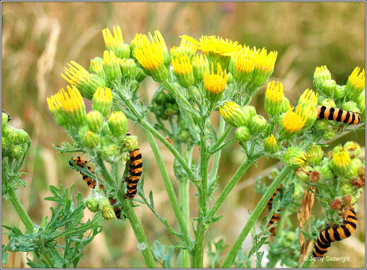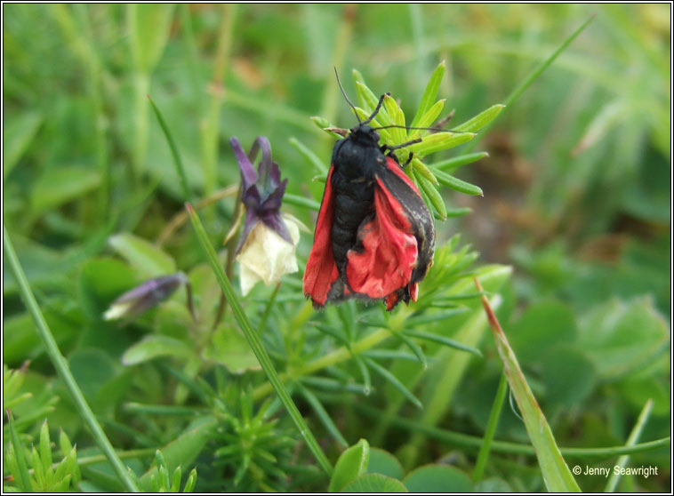 Tyria jacobaeae Widespread, common Wingspan: 32-42 mm Flight time: May-August Habitat: Prefers well-drained grassland and dunes but also found in gardens and open woodlands Larval food plant: Ragwort, also feed on Grounsel |