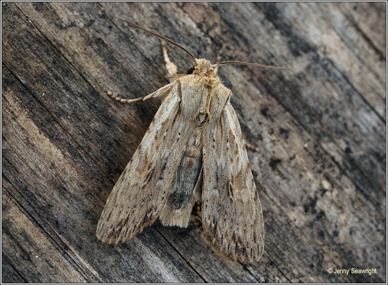 Family: Noctuidae Sub-family: Cuculliinae 2236 * Pale Pinion * Lithophane hepatica Widespread, locally common Wingspan: 38-42mm Flight time: October-November, hibernating then March-May Habitat: Broadleaved woodland, parks Larvae feed on a range of shrubs and trees including Bramble, Wild Privet, Oak, Birch and sallow |