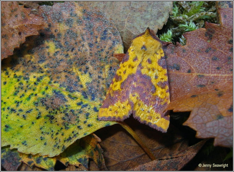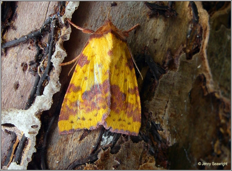 Xanthia togata Widespread, locally common Wingspan: 27-30mm. Deep pinkish-red head and shoulders. Flight time: August-November Habitat: Damp woods, heaths, moors, gardens Larvae feed first on sallows then on herbaceous plants Similar: Sallow has orange or yellow shoulders |