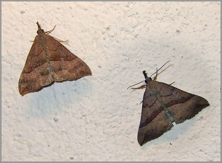 Hypena proboscidalis Widespread, common Wingspan: 25-38mm Flight time: Two generations, June-August, September-October Habitat: Woods, hedges, gardens, waste ground, fields, riverbanks Larval food plant: Nettles Similar: Shaded Broad-bar |