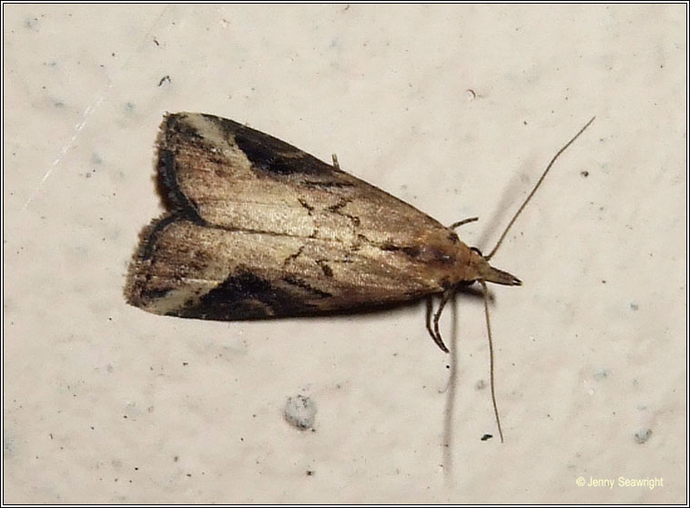 Schrankia costaestrigalis Locally common Wingspan: 16-22mm. Could be mistaken for a micro-moth Flight time: Two generations, May-October Habitat: Marshy areas, damp woods, boggy heaths, riversides Larval food plant is unknown in the wild |