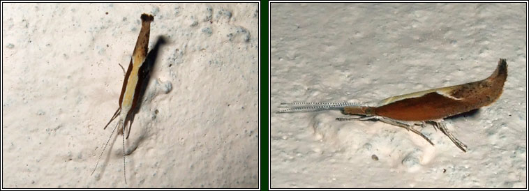 Family: Yponomeutidae Sub-family: Ypsolophinae 453 * Ypsolopha dentella Wingspan: 18-23mm Flight time: July-August Habitat: Gardens and woodland Larval food plant: Honeysuckle (Lonicera) |
