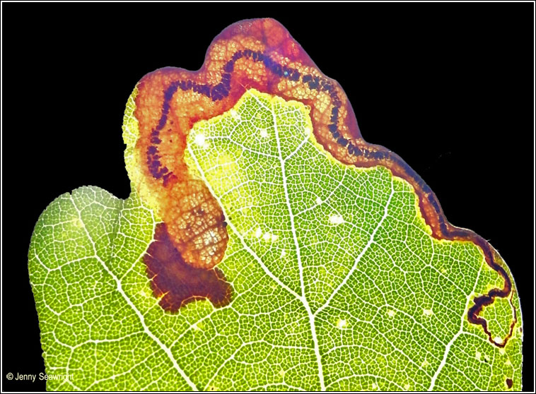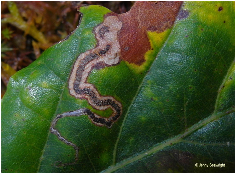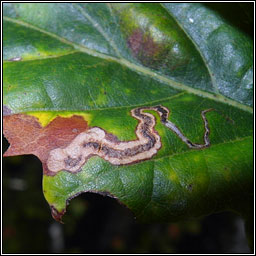 Stigmella sp. Photographed on Oak, Quercus sp. in October Most autumn Stigmella mines on Oak need breeding through for accurate identification |