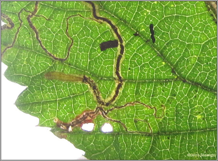 Family: Nepticulidae 54 * Stigmella auromarginella Q As the mine was vacated it is not possible to confirm identification.Leaf mine photographs on Bramble, Rubus fruticosus agg. August 2011. Reddish mine lower left. Wingspan: 3-5mm Flight time: June-August and September-November Food plants: Rosaceae; Rubus, Agrimonia, Mine: Can be found throughout the year Egg on upperside of leaf. The mine is a very short corridor with a central line of irregularly interupted frass. Similar: Stigmella aurella |