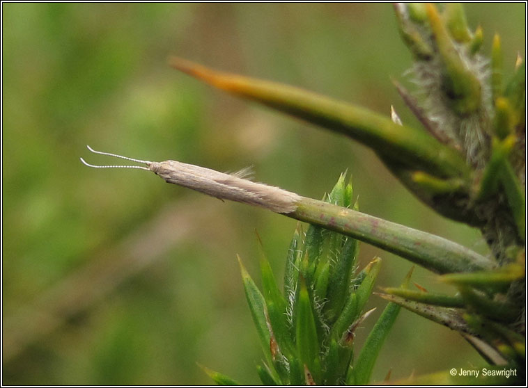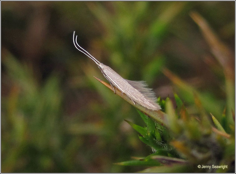 Family: Coleophoridae 544 * Coleophora albicosta (Probable identification)Wingspan: c.14mm. Need breeding or gen.det. for certain identification Flight time: May-June Habitat: Found in most habitats where food plant grows Larvae feed on Gorse seeds |