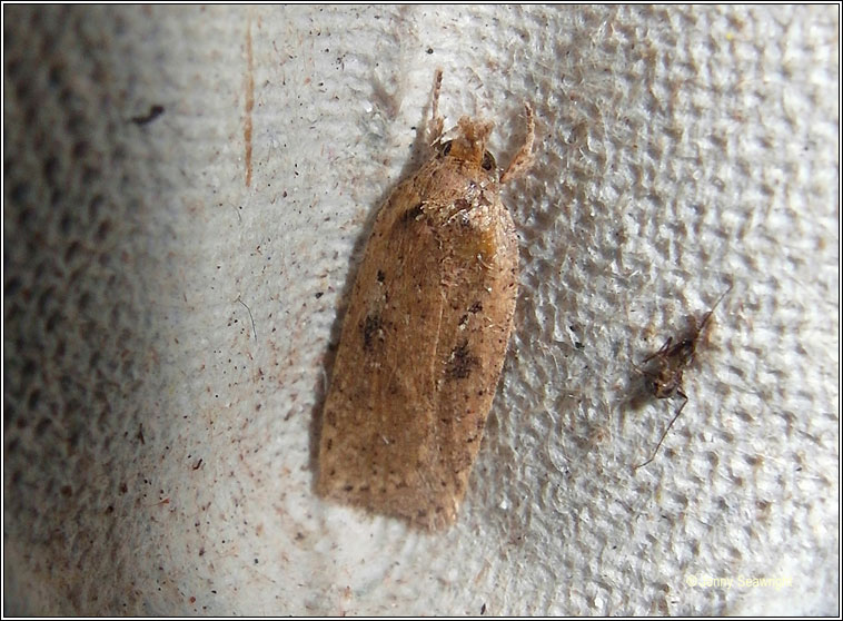 Family: Oecophoridae Sub-family: Depressariinae 696x * Agonopterix propinquella/subpropinquella Wingspan: A. propinquella 16-19mm, A. subpropinquella 16-22mm Flight time: August-May, hibernating through winter Larvae mine undersides of leaves then feed in web beneath leaves. Larvae of A. propinquella feed on Creeping Thistle and Spear Thistle, A. subpropinquella on Knapweed (Centaurea spp.)and Thistles (Cirsium) Usually recorded as 696x Agonopterix propinquella / subpropinquella. Require breeding from foodplant or genitalia examination to separate. |