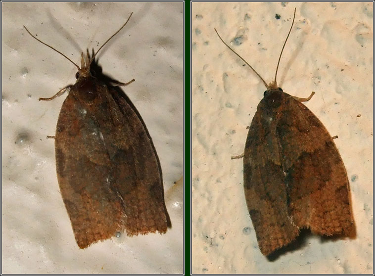 Pandemis heparana Widespread, fairly common Wingspan: 16-24mm. Distinct 'tooth' in centre of cross-line on each forewing. Flight time: June-September Habitat: Woodland, gardens Food plant: Rolled leaves of fruit and deciduous trees Very similar: Barred Fruit-tree Tortrix |